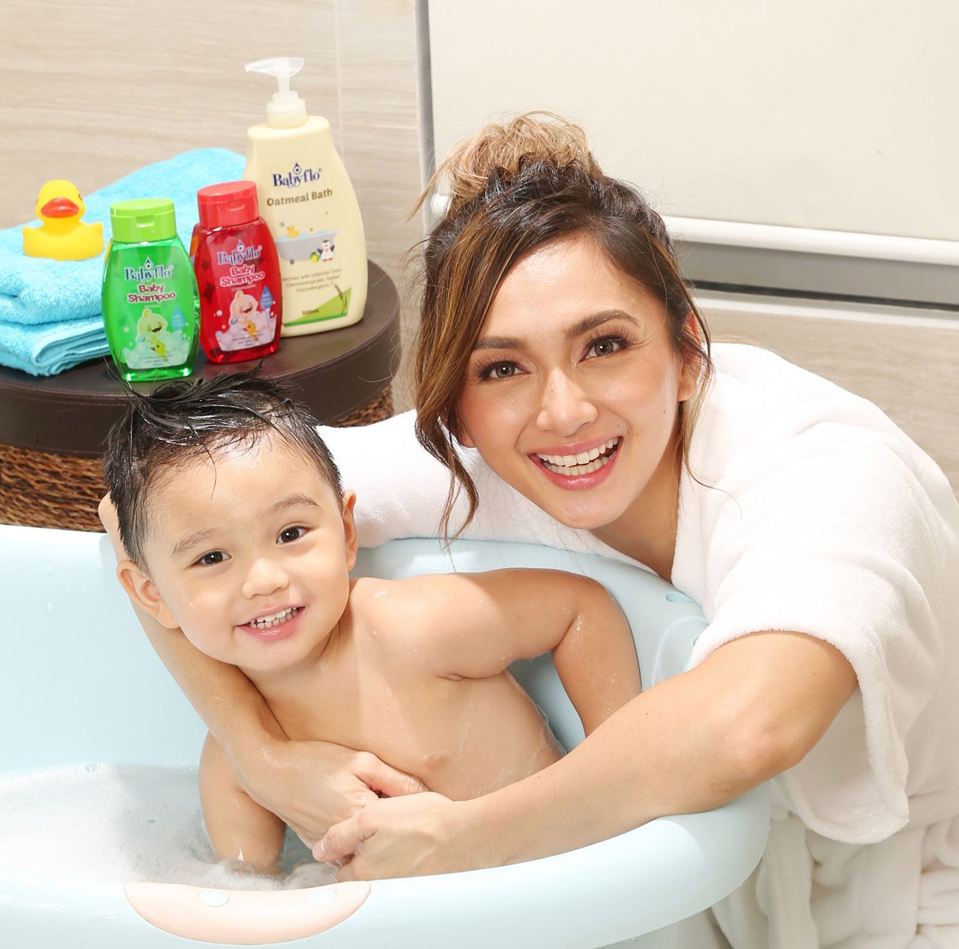 Remember when you used to create the craziest hairstyles imaginable when you were a kid during bath time? Iya and her boys also get a kick out of making them: mohawks, horns, the Eiffel Tower, name it, they’ve tried it! “I like Babyflo Shampoo. It lathers well and leaves their hair soft and smelling baby fresh.” The shampoo’s formula is completely free of harsh chemicals that irritate eyes, which is a huge plus for the wonder mom. “It definitely keeps bath time tear-free for us,” she laughs.