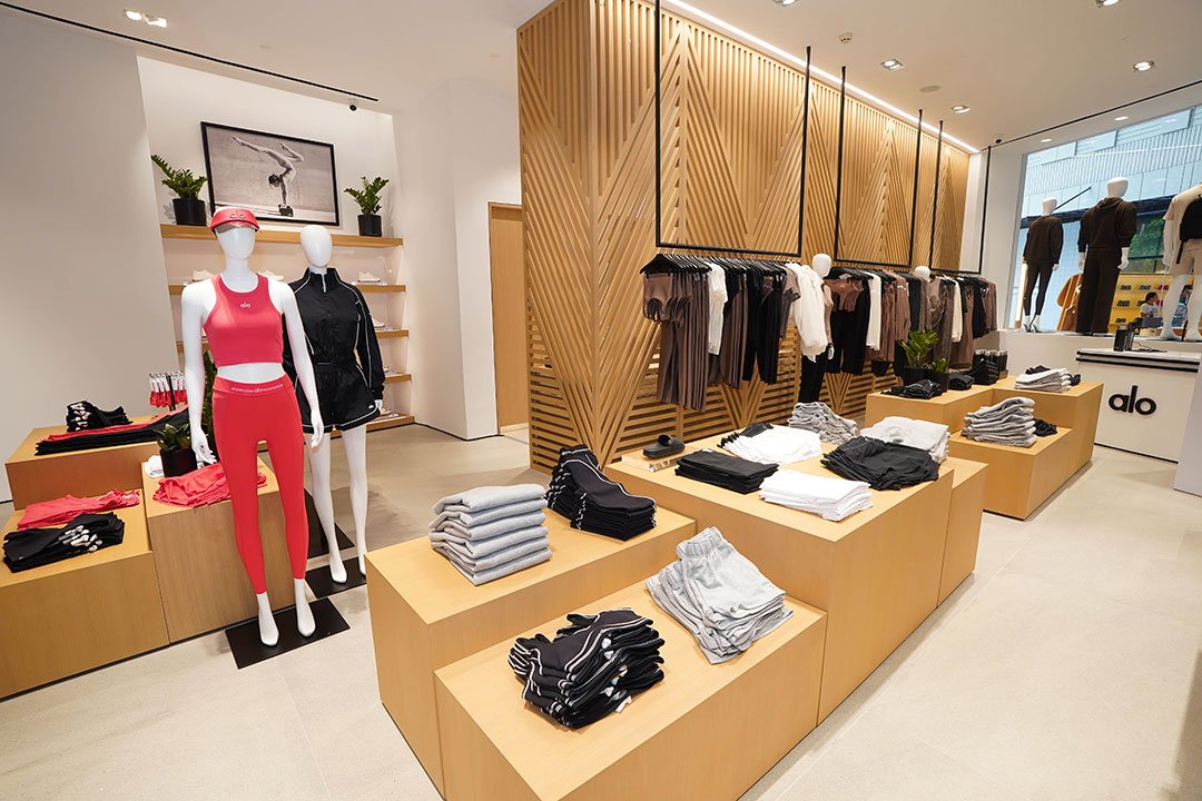 The store layout promotes a mindful shopping experience, with clean lines, warm lighting, and a calm palette that echoes Alo’s wellness roots.