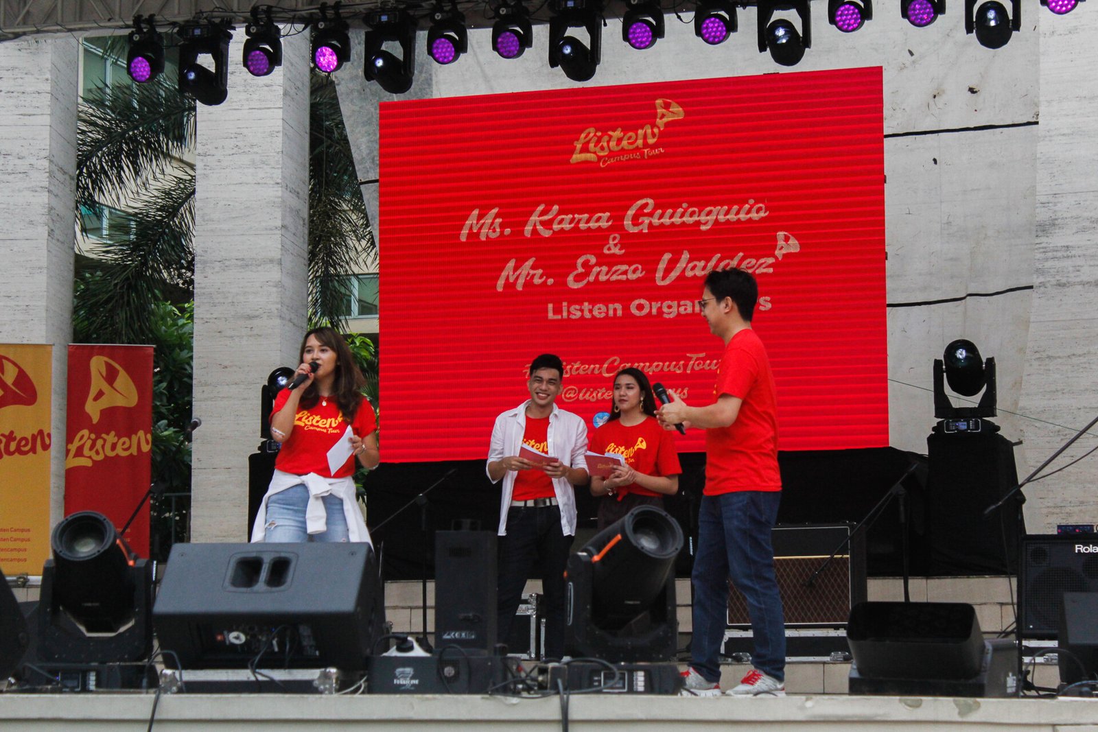 From left to right: Kara Guioguio (Listen Campus Tour Organizer), Allan Moya (Tatak Tamaraw Welcome Fest 2019 host), Patricia Mistica (Tatak Tamaraw Welcome Fest 2019 host), and Enzo Valdez (Listen Campus Tour Organizer) talks about mental health as Listen Campus Tour’s advocacy