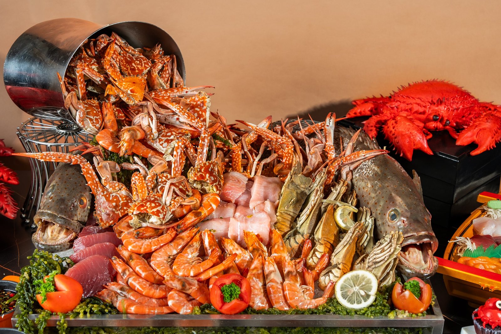 A lavish seafood buffet showcasing sustainably sourced prawns, crabs, shellfish, and lobsters.