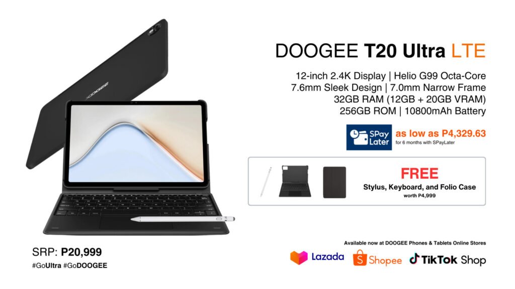Don’t discount the T20 Ultra’s performance as it’s equipped with an Octa-Core processor, making gaming possible in a tablet. Balance productivity and power efficiency with its onboard 32GB of RAM (12GB + 20GB VRAM) and generous 256GB ROM. The tablet also has a 10,800 mAh battery and runs Android 13 out of the box. It has 8 MP front-facing and 16 MP rear-facing cameras, quad speakers, and Widevine L1 certification for streaming DRM-protected at 1080p. This is available for Php20,999 with a FREE Stylus, Keyboard, and Folio Case or get it as low as P4,329.63 for 6 months with SPayLater! #GoUltra #GoDOOGEE