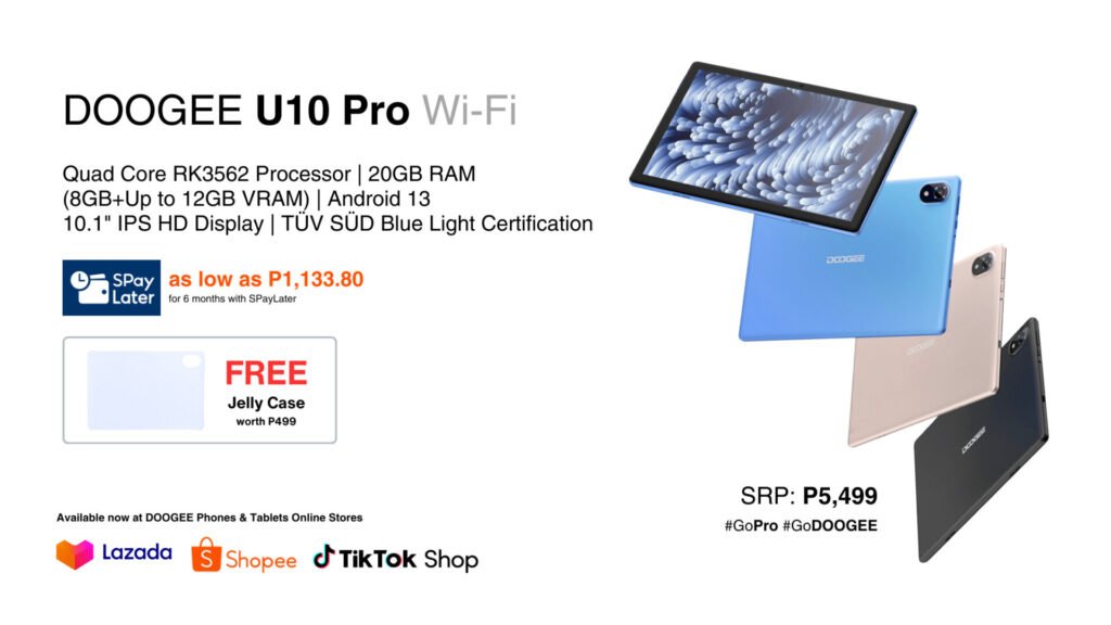 The tablet has a 5,060 mAh battery, Wi-Fi 6 connectivity, and stereo speakers. This affordable Android tablet has a bigger RAM of up to 20GB (8GB + 12GB VRAM) compared to the base model U10 (up to 9GB), making multitasking more efficient. The DOOGEE U10 Pro is available for only Php5,499 and comes with a FREE Jelly Case inside the box. Lighter payments per month are available with SPayLater! Get the U10 Pro for only P1,133.80 per month for 6 months via Shopee! #GoPro #GoDOOGEE