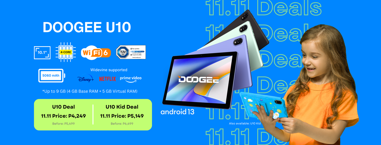 | U10 Kid (9GB + 128GB) | P6,499 | P5,149 | P1,350 | Special Kids Anti-Bacterial Case |