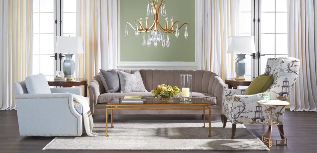 Ethan Allen’s centerpiece for the evening was The Transcendence Collection, featuring beautifully crafted pieces with sleek transitional shapes, new wood finishes, and unique fabric textures. One standout piece was the Ethan Allen Nathalie sofa, drawing inspiration from the Art Deco-era. The Natalie sofa features a glamorous barrel-back design and offers stain-resistant fabric choices for everyday livable luxury in your home. The collection also introduced updated styles and finishes for console tables. Carson, an elegant addition to entryways which also doubles as a slim desk option, is a true work of art. Another interesting piece is Grafton, with its simplified demilune shape and hand-applied olive ash burl veneers, featuring an exquisite Italian Carrara marble tabletop.