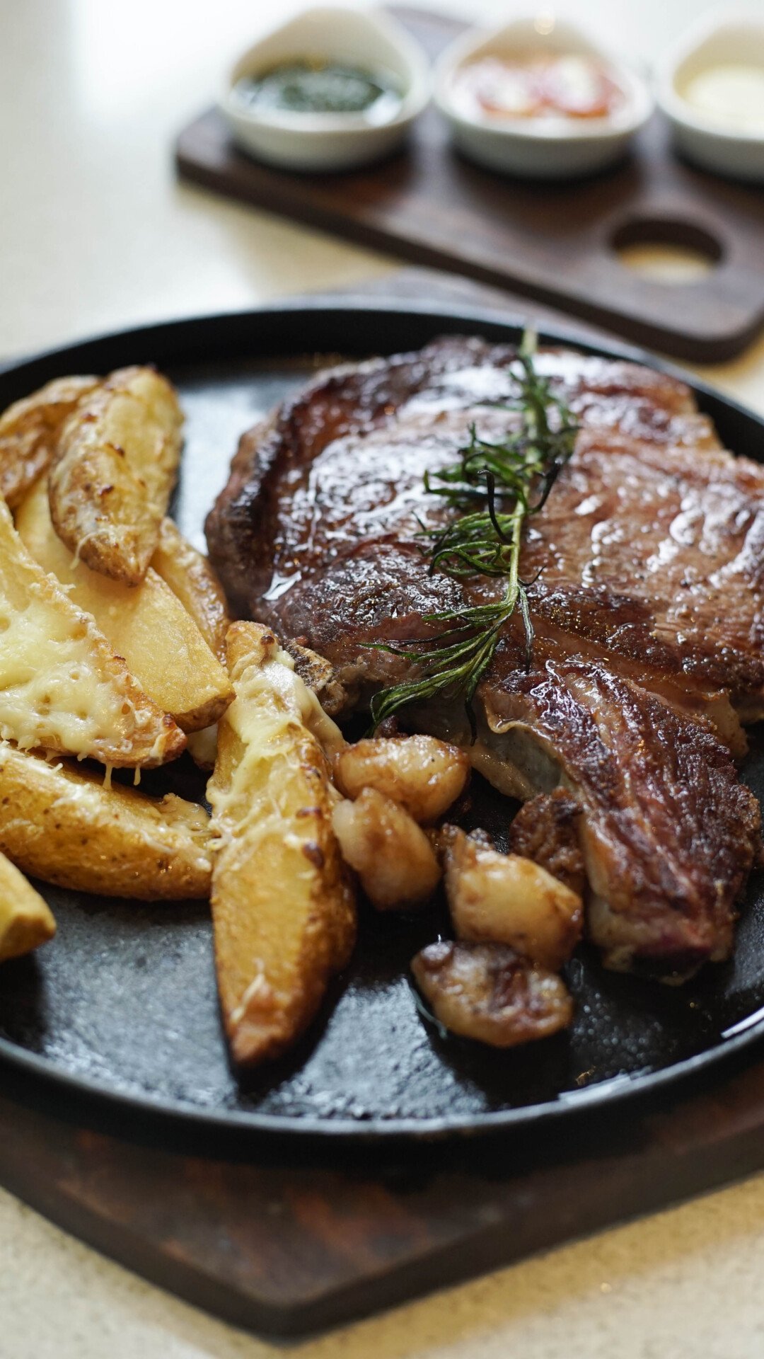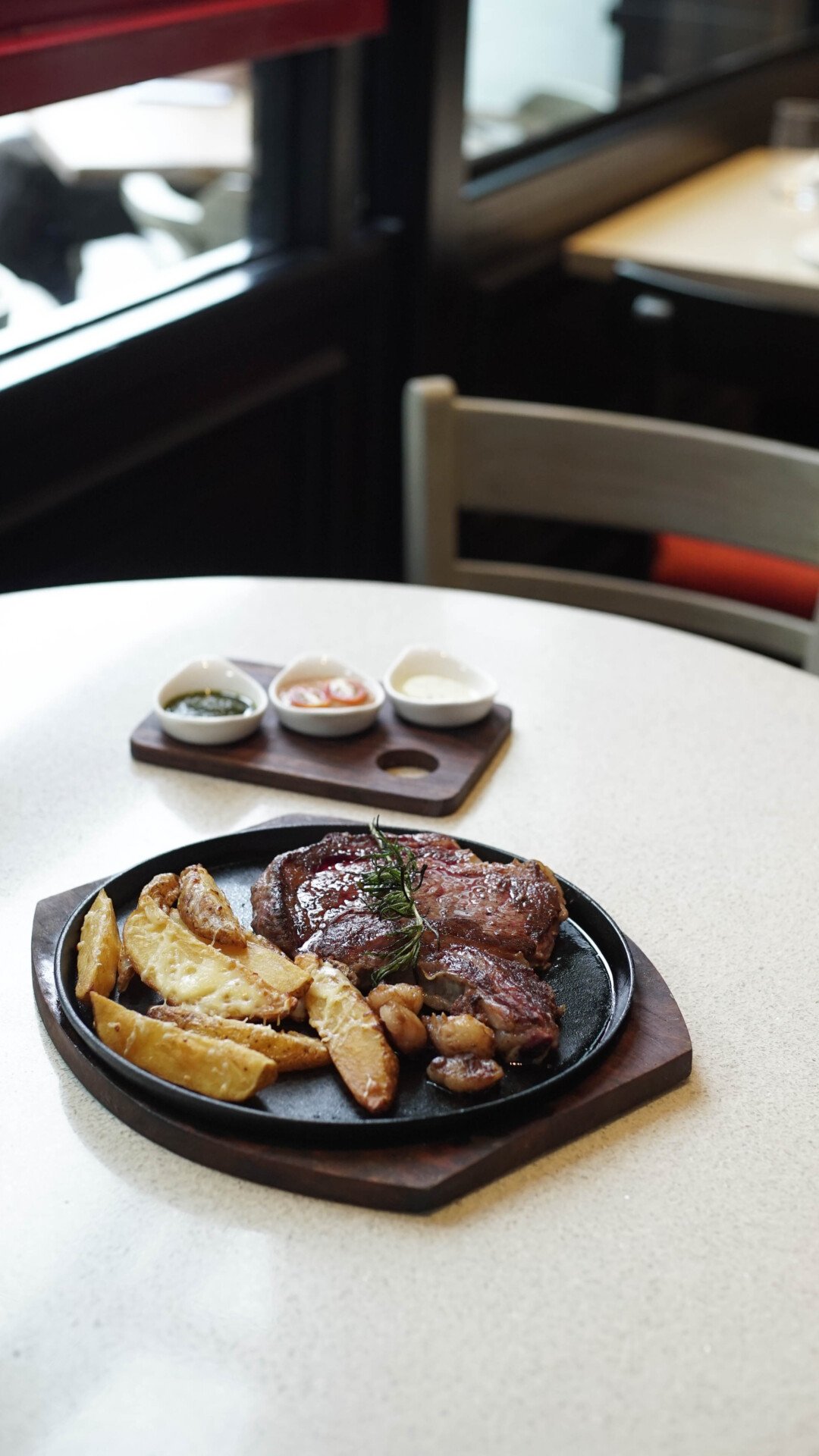 The dish comes with three sauces: The blue cheese butter, bois baudran, and chimichurri. We loved mixing the freshness of chimuchurri flavors with the savory bliss of the blue cheese butter with our hefty slab of meat—together, a medley of tastes one can’t help but relish. The steak also comes with thick potato wedges toasted to a crisp with cheese.