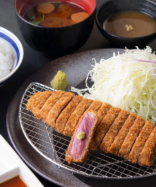 Gyukatsu is a dish consisting of beef cutlets, in contrast to tonkatsu, which is made from pork cutlets. It is known for its unique preparation method where the beef is often left rare in the center, resulting in a crispy outer coating and a juicy, beefy, perfect medium rare middle. The key to its exceptional taste lies in the use of only premium beef, ensuring a high quality and flavorful dining experience.