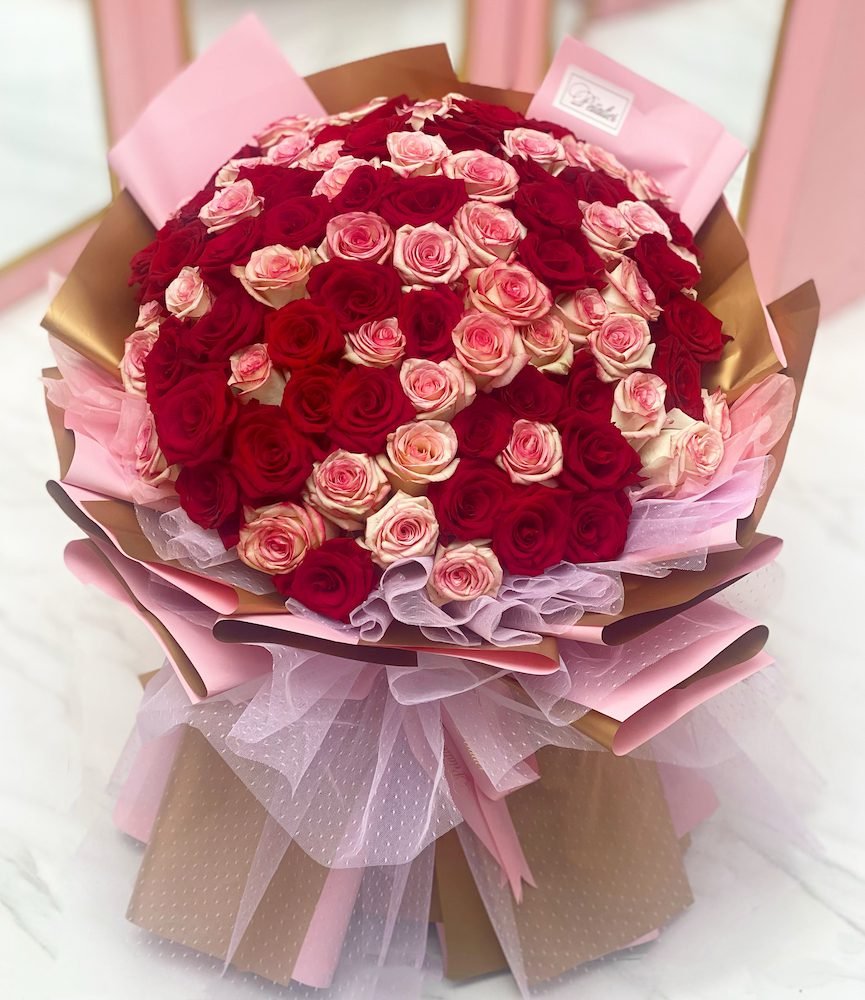 Indeed, there are so many ways to say I love you, but nothing beats an exquisitely wrapped bouquet, boasting a hundred stems of fresh Ecuadorian roses in your choice of color, styled elegantly with stunning bouquet wrappers.