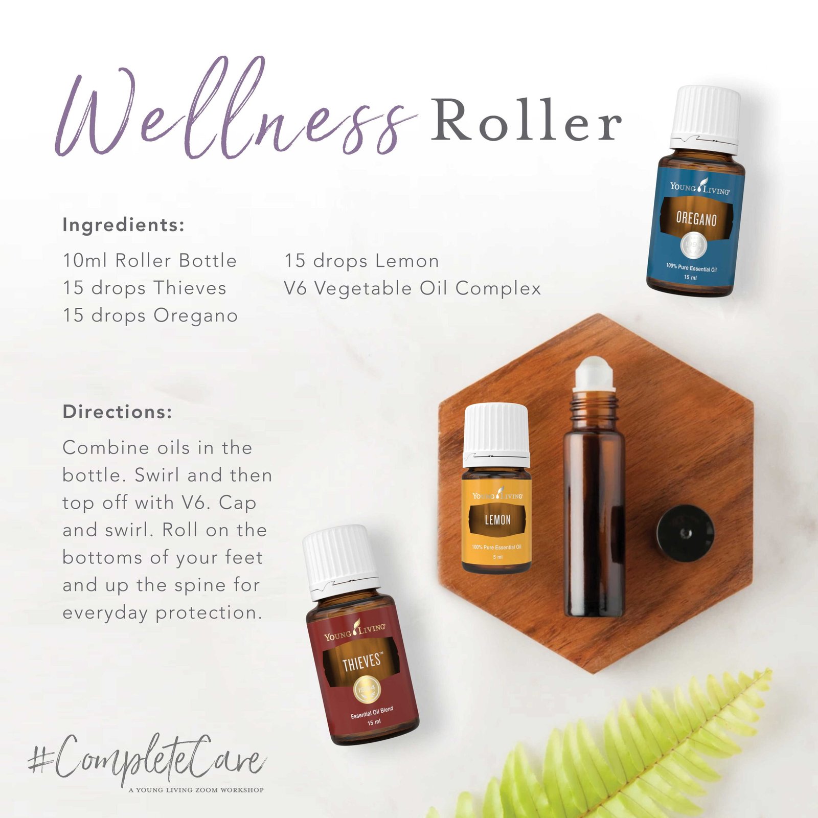 Another way to use essential oils is to apply them to specific points of the body. For this, Geri recommends whipping up a wellness roller with Young Living’s Thieves, Oregano, and Lemon Essential Oils with the V6 Carrier.