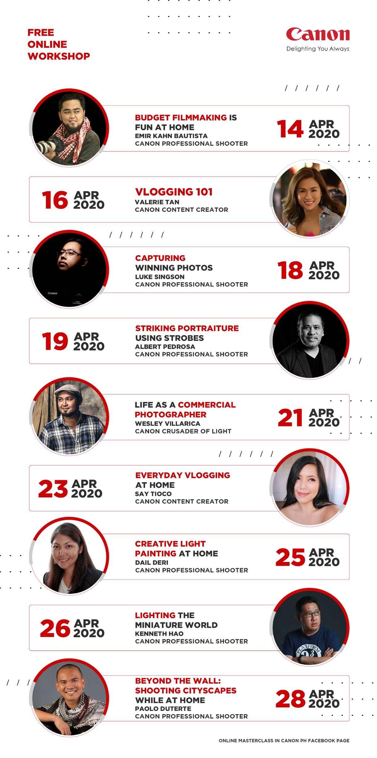 Check out the online workshop schedules of the following visual storytellers below; all sessions will be hosted on Canon’s official Facebook page at 8:00pm on their assigned date: