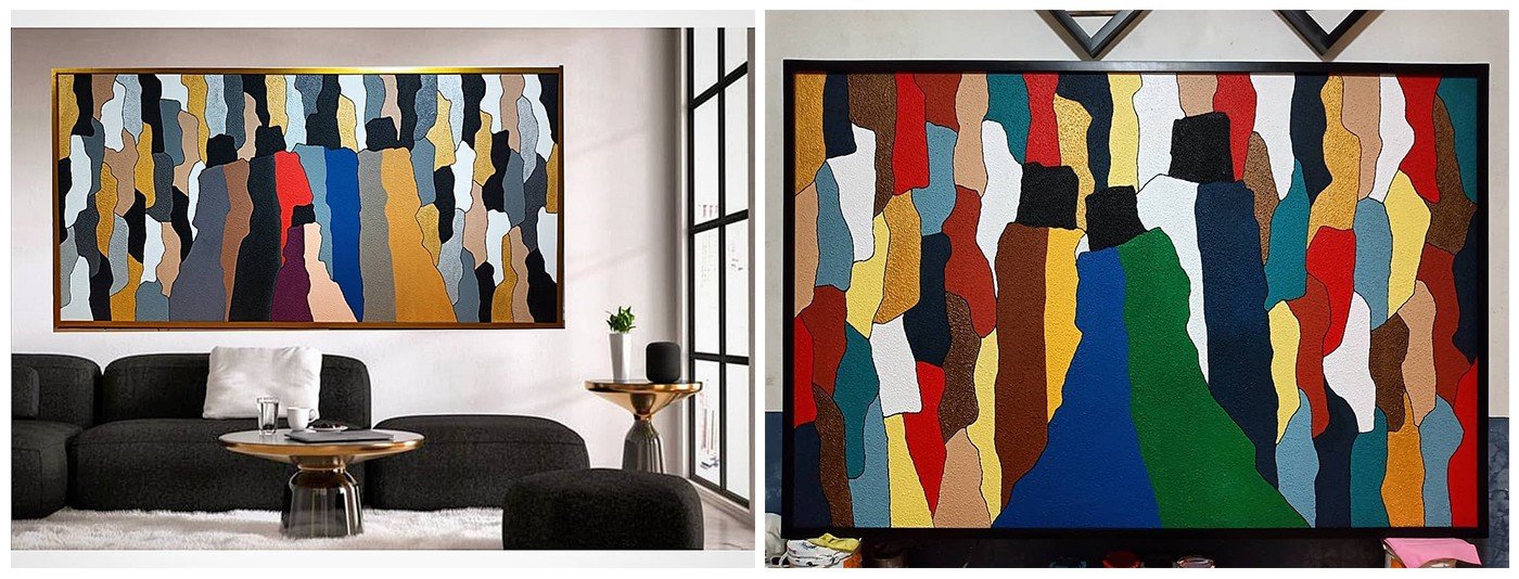 Mylene specializes in painting patterns in a colorful way. She uses mostly metallic and bright coloured acrylic– playing around textures to create fine and raw details. One of her most in-demand collections is her “Familia Series” which has found patrons in celebrities like Derek Ramsay, Raymart Santiago, Shaina Magdayao. Other famous works of hers are her “gray series” – where rolling brushes and smudging tools are the dominant style.