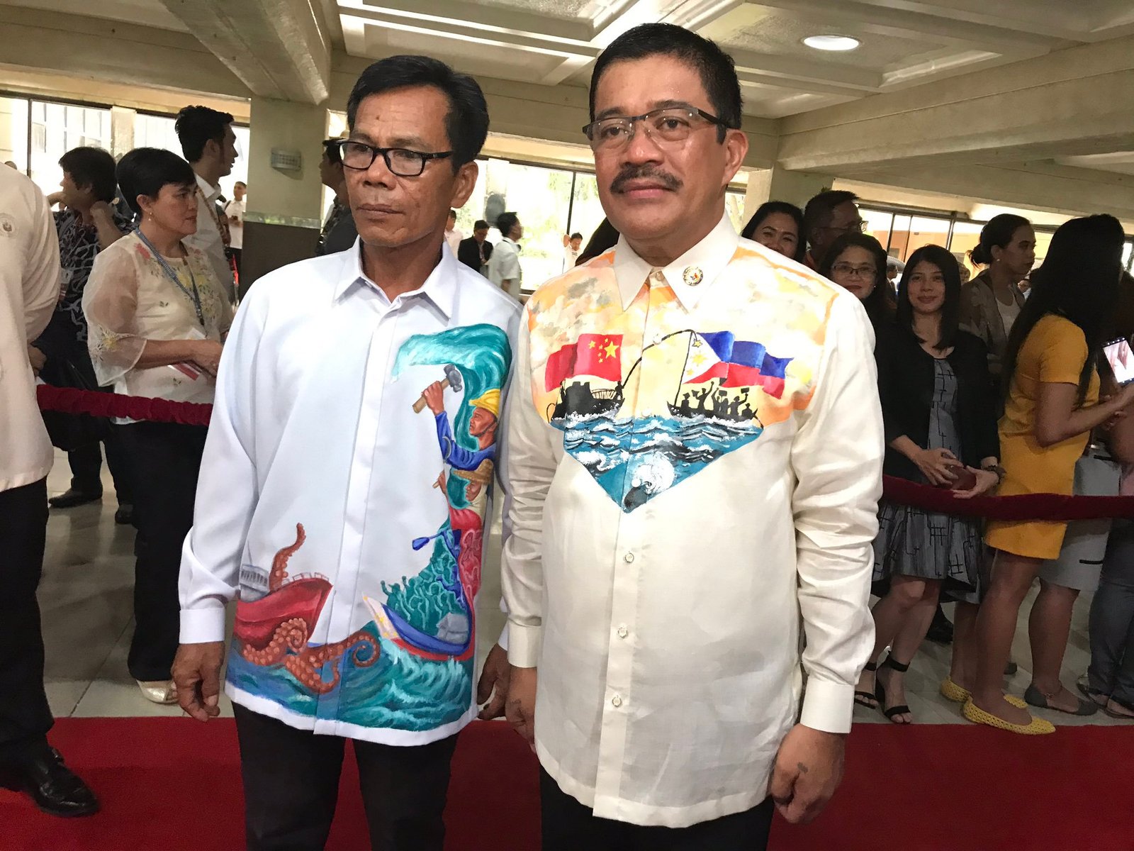 This Bayan Muna representative wore a handpainted barong that featured the current plight of Filipino fishermen in the West Philippine Sea. It was a protest against the administration’s inaction against the encroachment of China in the country’s exclusive economic zone. Here he is pictured with fisherman Ka Bobby.