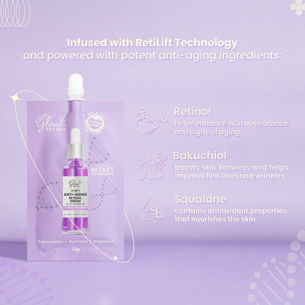 Unlike other retinol formulas in the market, Hello Glow’s 3-in-1 Retinol Serum is formulated with Retilift Technology, a proprietary technology that ensures effective penetration of retinol into the skin, maximizing its anti-aging benefits!
