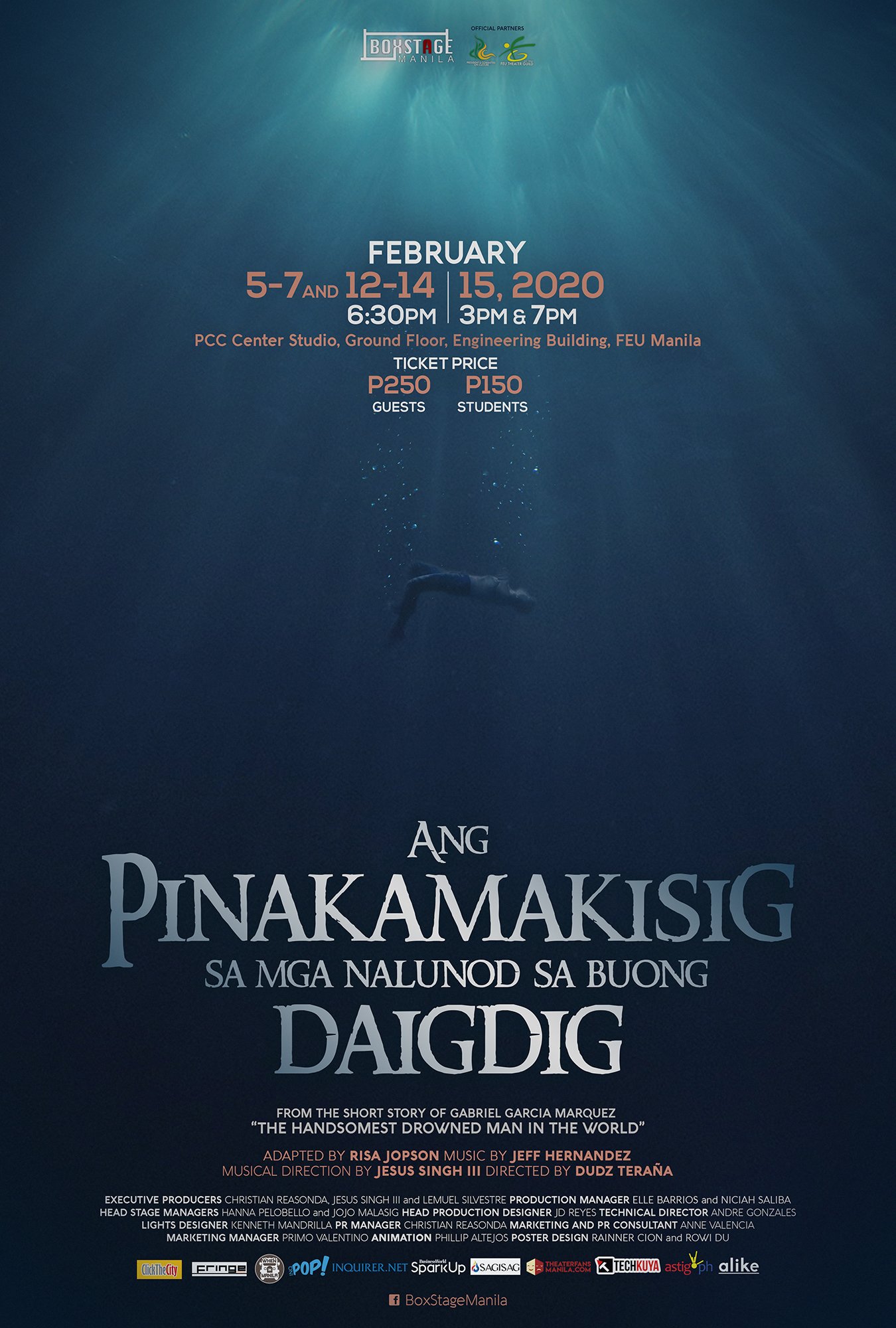 Directed by Dudz Terana, written by Risa Jopson, music by Jeff Hernandez, and music direction by Jesus Singh III, the musical will run on Feb 5-7 and 12-15 at the PCC Center Studio, Ground Floor, Engineering Building, FEU Manila.