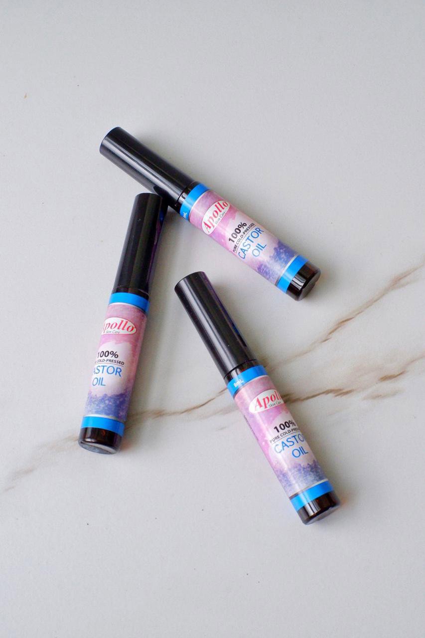 The new Apollo Castor Oil comes in a mascara bottle. All there is to do is dip the mascara wand into the product, wipe off the excess, and swipe a thin layer of oil onto the lashes and brows. Make sure to rinse it off in the morning or before you apply your makeup.