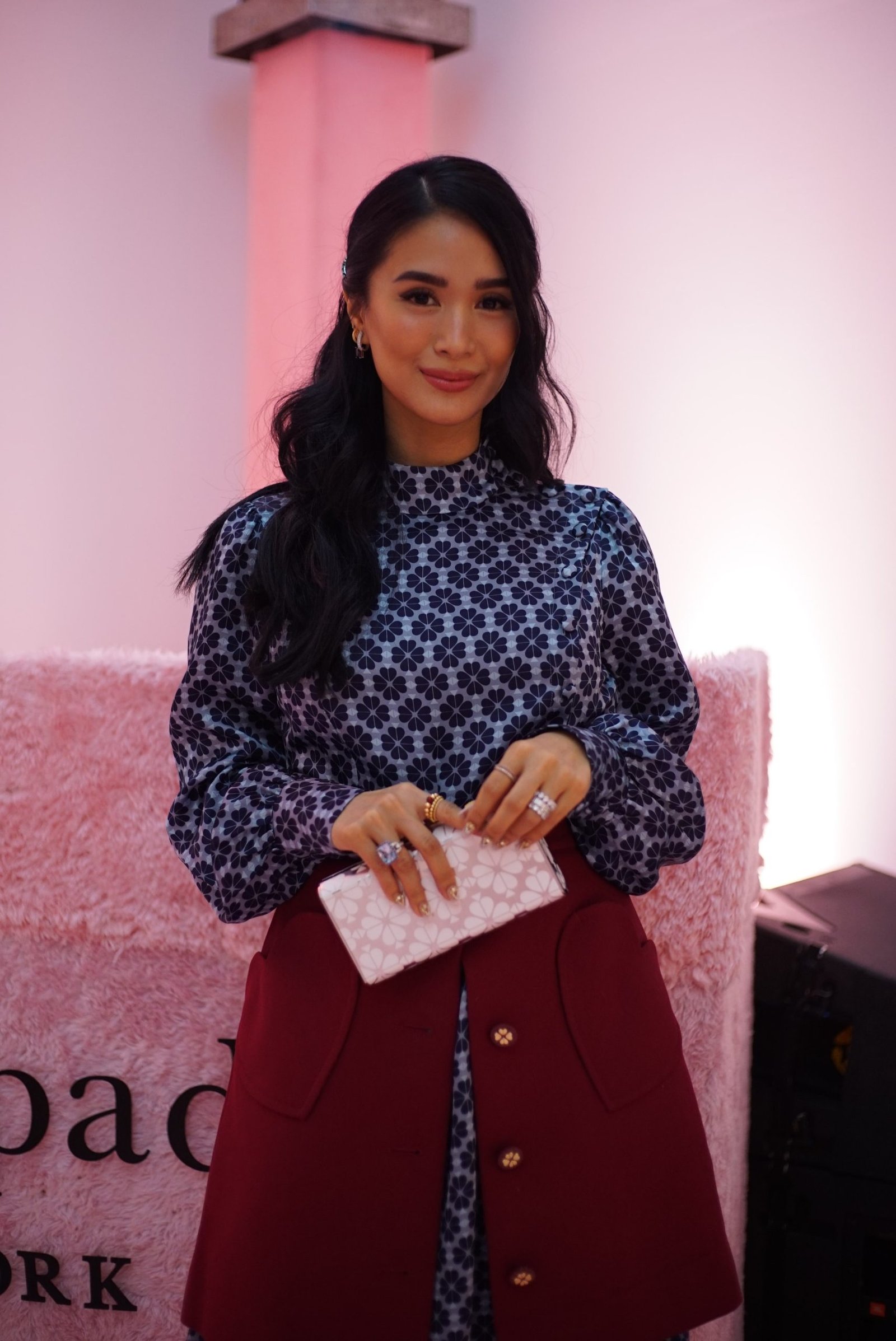 Even in a room full of prints and beautiful ensembles, Heart Evangelista has a certain glow around her that makes her stand out. She wore a long-sleeved satin dress in shades of blue, embroidered with Kate Spade’s logo—which is now recreated to form into blossomed flowers for their 2019 Spring/Summer collection.