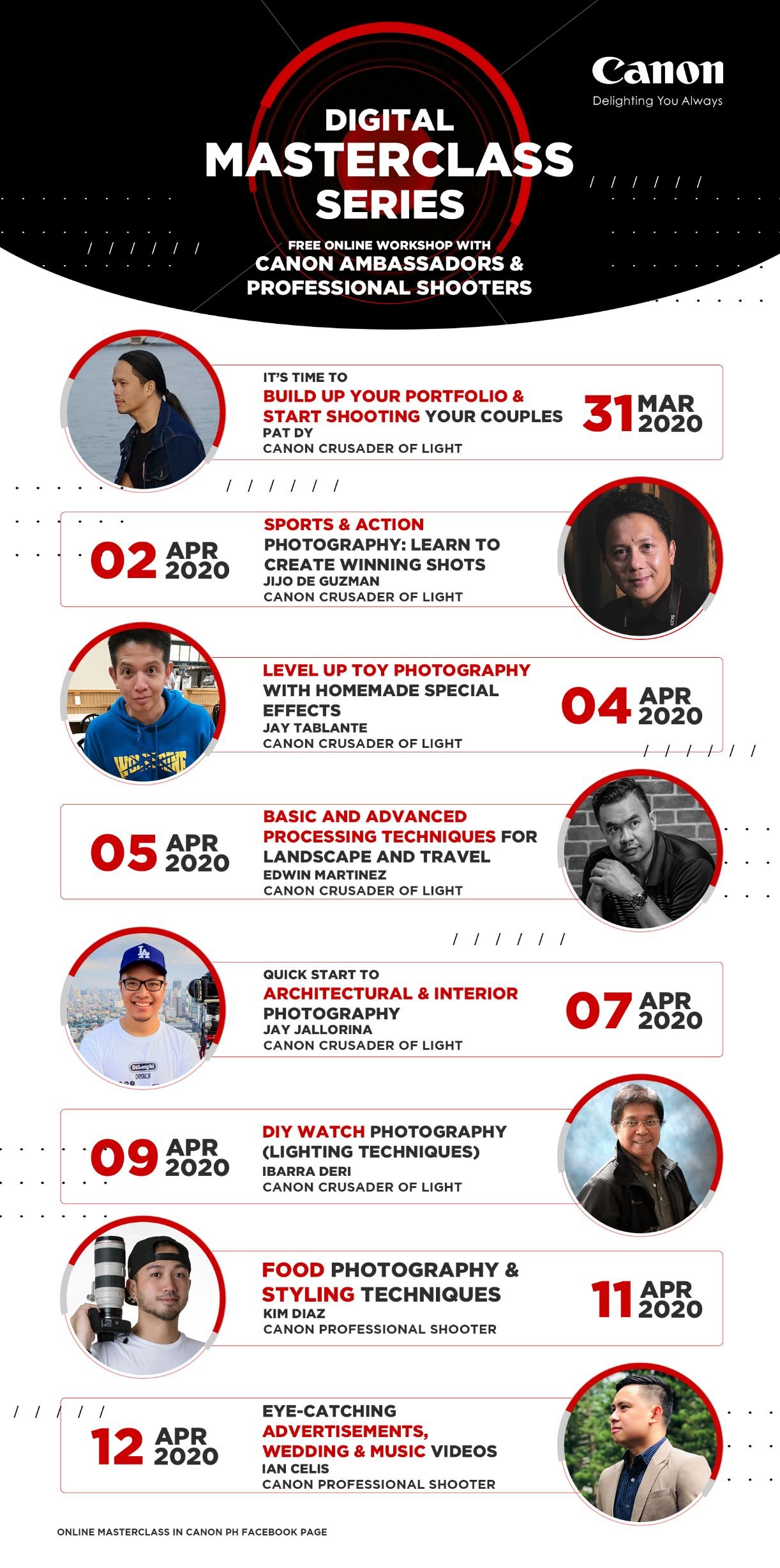 Check out the online workshop schedules of the following visual storytellers below; all sessions will be hosted on Canon’s official Facebook page at 8:00pm on their assigned date: