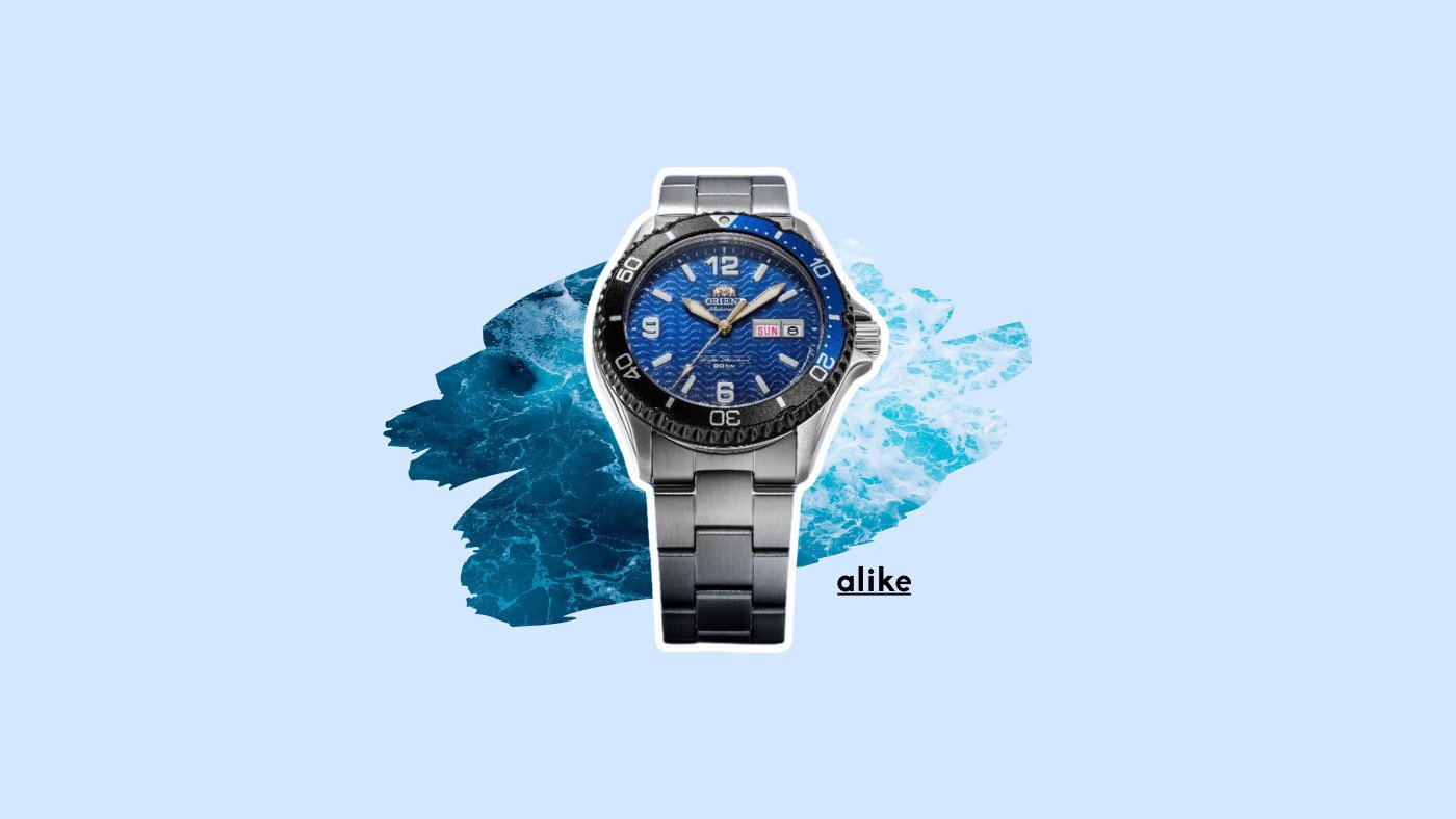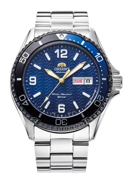 The unidirectional rotating bezel with six grooves, common to all Orient Mako models, is coupled with a two-toned blue and black aluminium plate with the colours separating at the triangular and 20-minute markers.