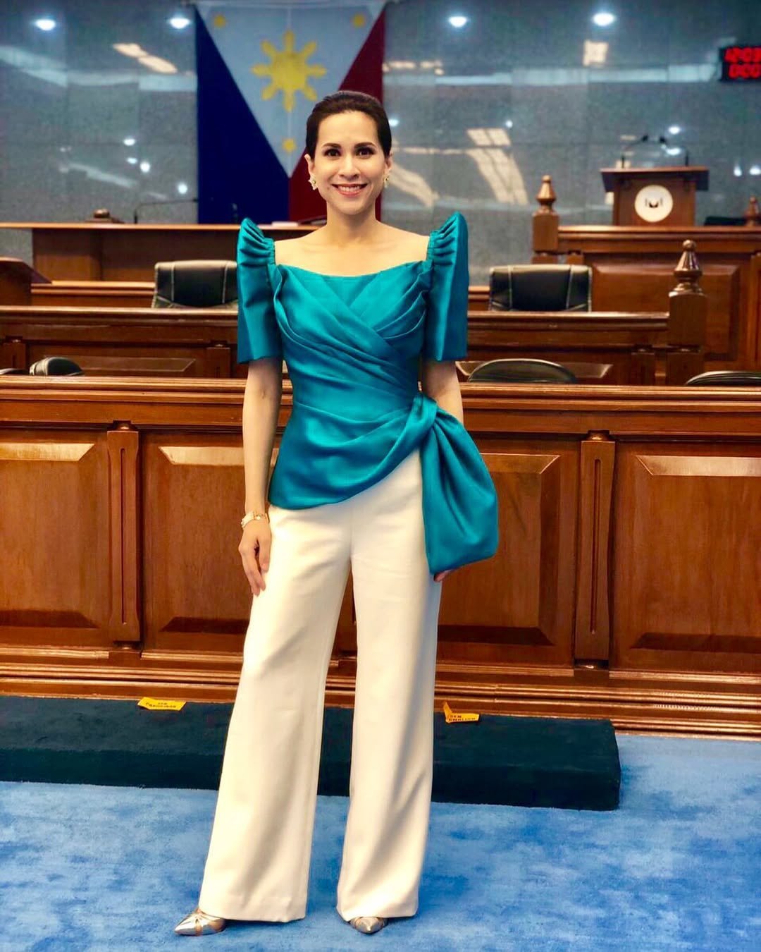 Another Michael Leyva creation is seen on the SONA red carpet. The designer gave Tootsy Angara some sleek and classy silhouettes.