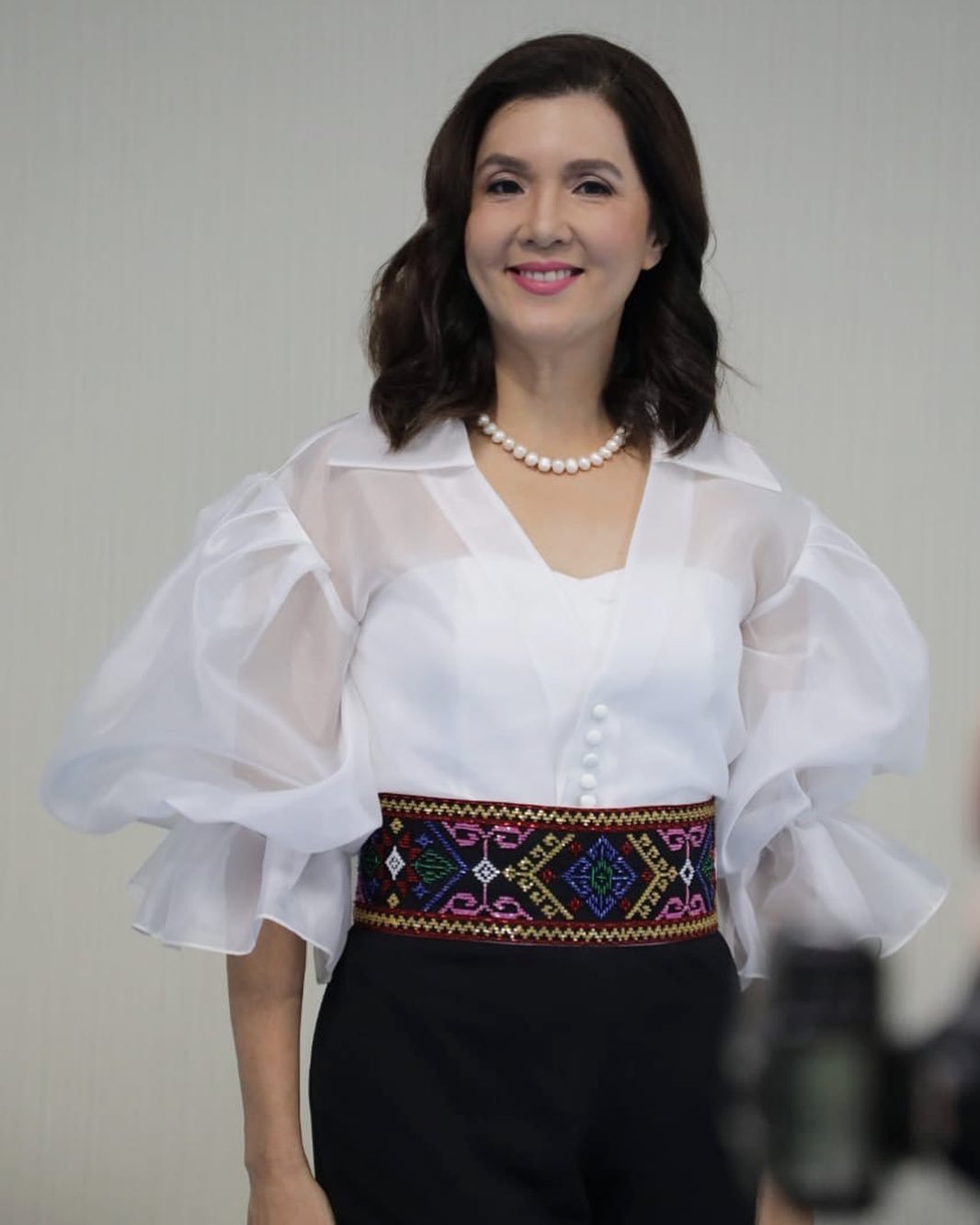 Pia Cayetano wears a Michael Leyva barong top and pants as she goes back to work in the Senate. Her black-and-white outfit was accentuated with a belt made with Yakan fabric.