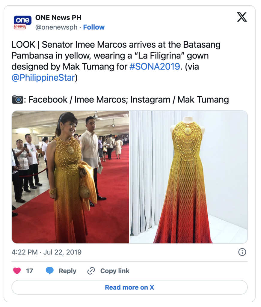 The Senator makes fun of the opposition and jests: “Dilawan ako” with her Mak Tumang gown.