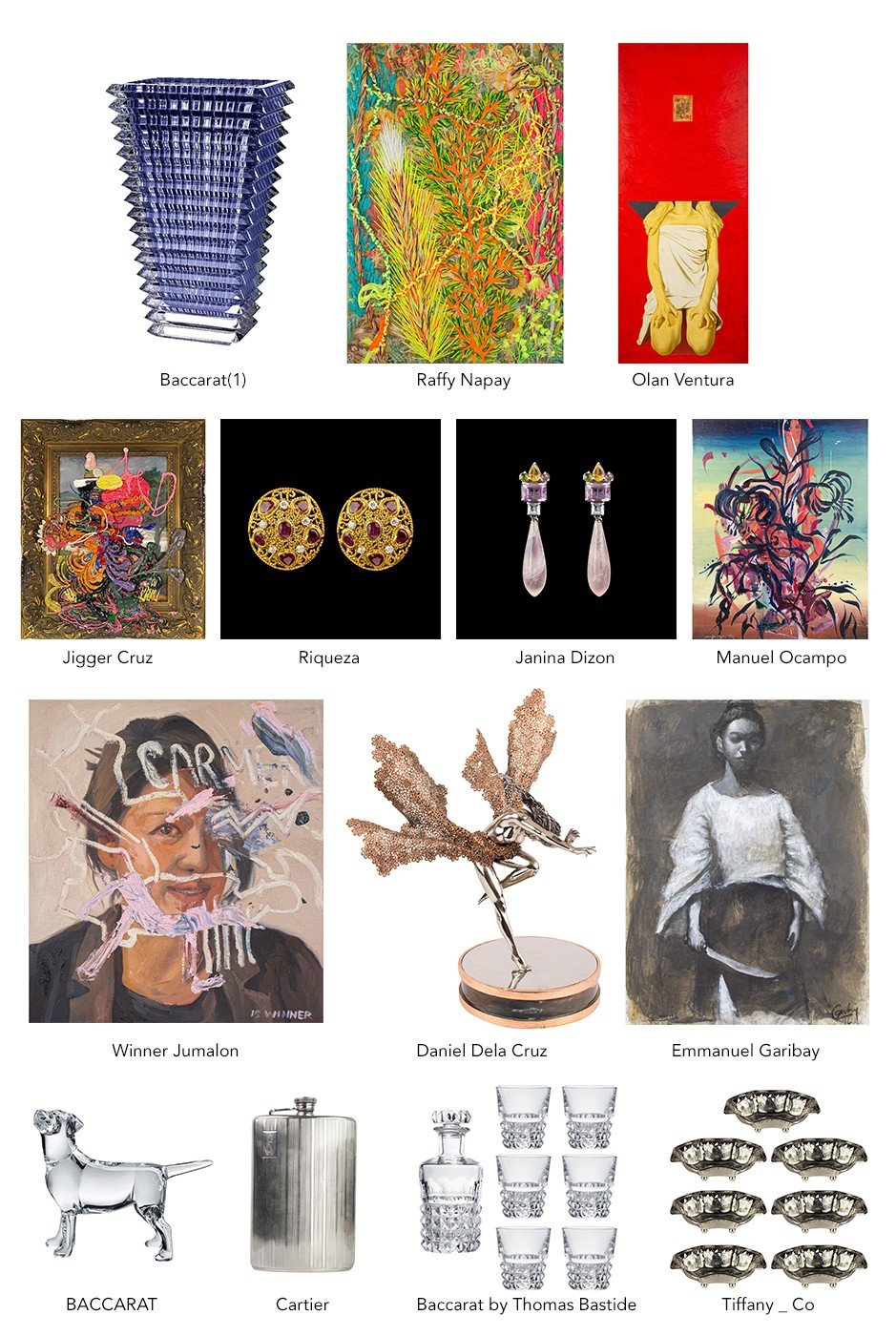 The auction will feature close to 100 lots, with proceeds helping to support the foundation’s work in the illness’ early detection and proper treatment. Among the lots going under the gavel are works by leading contemporary Filipino visual artists such as Emmanuel Garibay, Raffy Napay, Jigger Cruz, Alfredo Esquillo, Jr., Manuel Ocampo, Daniel dela Cruz, Winner Jumalon, and Olan Ventura. Also going under the hammer are sterling silver pieces from Cartier and Tiffany & Co., fine Baccarat and Lalique crystal, as well as jewelry by Riqueza and Janina Dizon.
